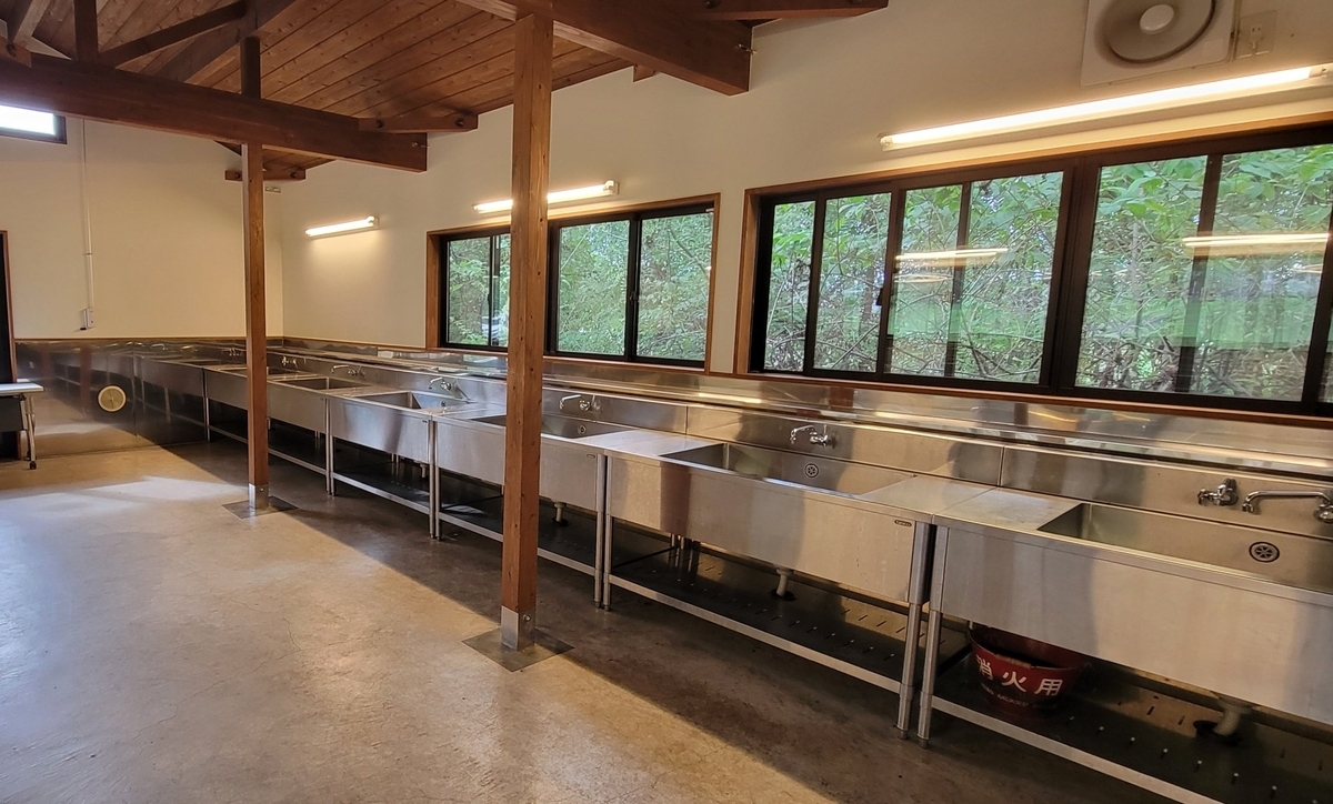 炊事場は屋内に1箇所、お湯が出ます。