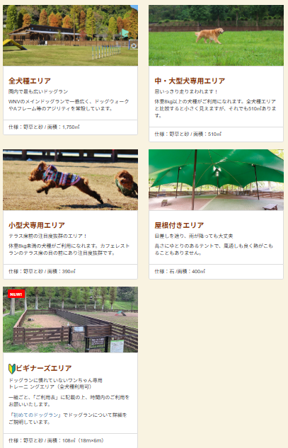 ドッグランは5種類、大きさ別や屋根あり、初心者用と豊富です。