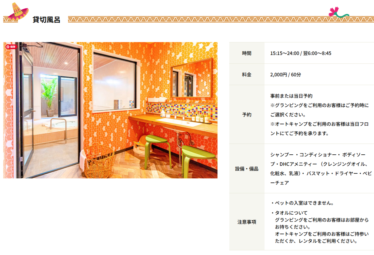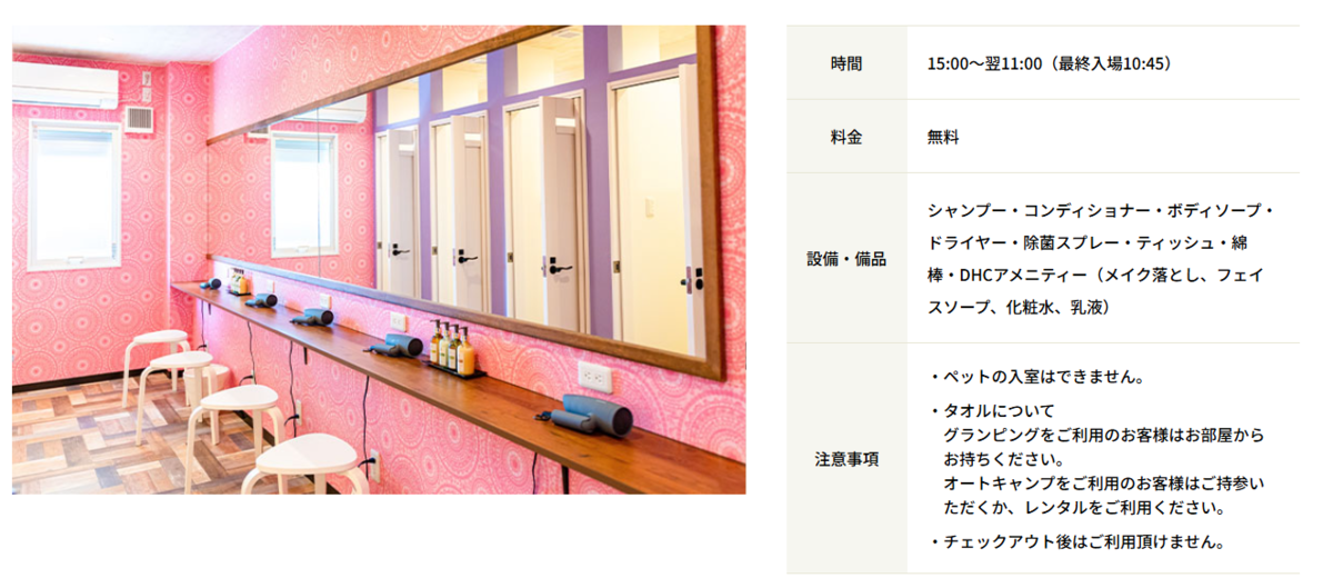 | 風呂シャワー | 無料シャワー、有料貸切風呂あり |